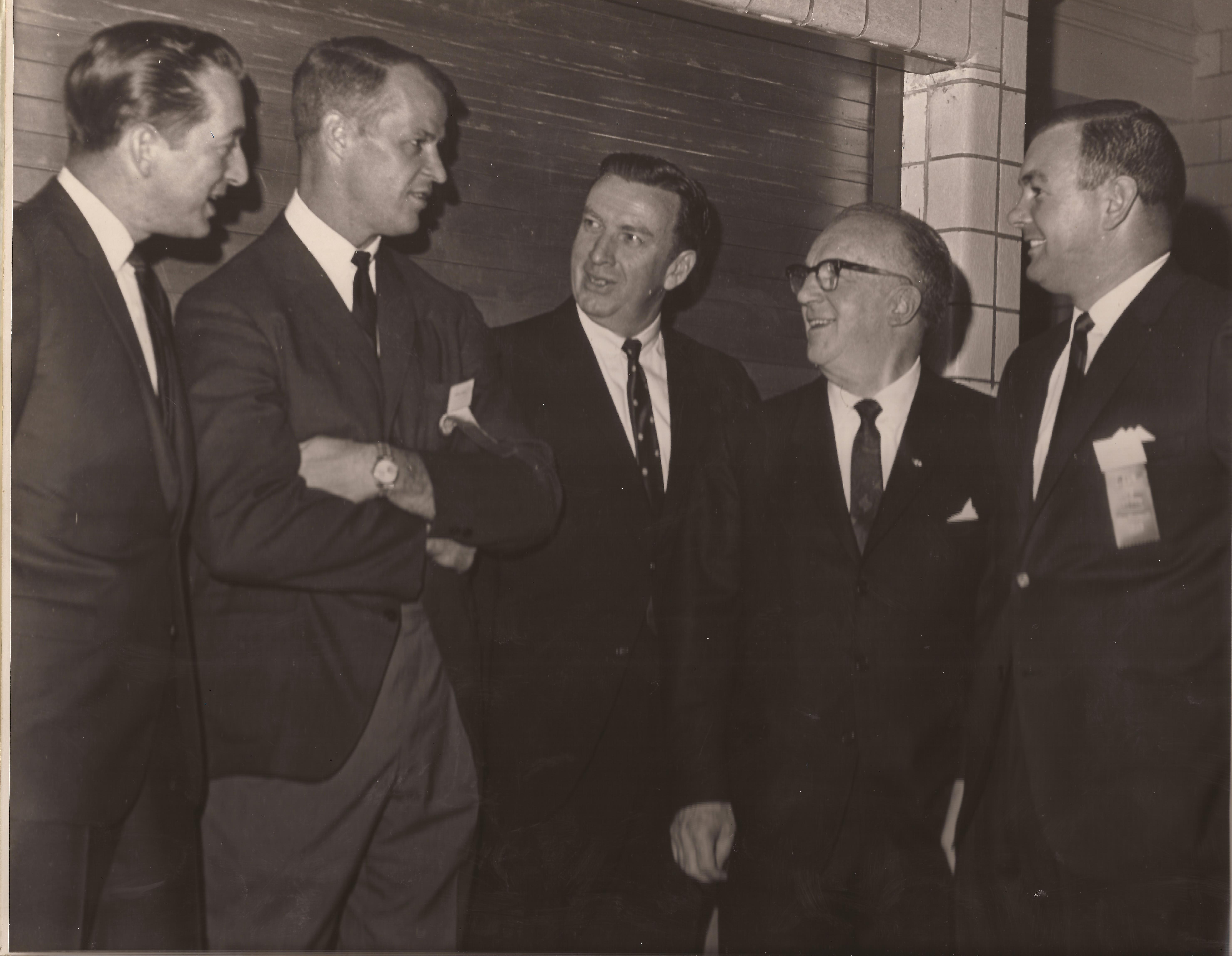 Hockey minds and talents John Daley, Gordie Howe, Jack Riley, John Mitchell and Don Hall at 1965 banquet.